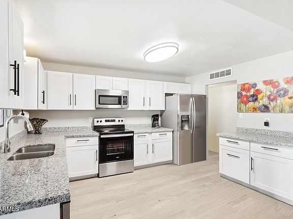 Remodeled & move in ready home in the highly desirable Paradise Valley Oasis neighborhood! Situated on a corner, cul de sac lot (approx 11,000 sq ft), this property offers an RV gate, RV parking & the rare advantage of NO HOA! The spacious backyard is a blank canvas with endless possibilities; whether you envision a pool, workshop, sports court, or a lush outdoor oasis, there's plenty of room to bring your vision to life. Inside, you'll find a thoughtfully designed open-concept floor plan with vaulted ceilings that create an airy, inviting atmosphere. The family room includes a versatile bonus space, perfect for a home office, playroom, or additional lounge area. The updated kitchen boasts white shaker cabinets with sleek black hardware, granite countertops & & stainless-steel appliances. Stylish wood-look tile flooring runs throughout the main living areas. Both bathrooms have been tastefully updated & all 3 bedrooms feature carpeting & ceiling fans. Step outside through the sliding glass door off the kitchen to a large, covered patio, where you have mountain views & is ideal for entertaining! PLUS, there's an outdoor storage room that can double as a workshop or hobby space. Located near the 51 Freeway, this home provides easy freeway access & you are minuted from hiking/biking trails, top-rated schools in the Paradise Valley School District, a variety of shopping & dining options & the brand-new PV Mall! Don't miss out on this stylish, upgraded home in a prime location.