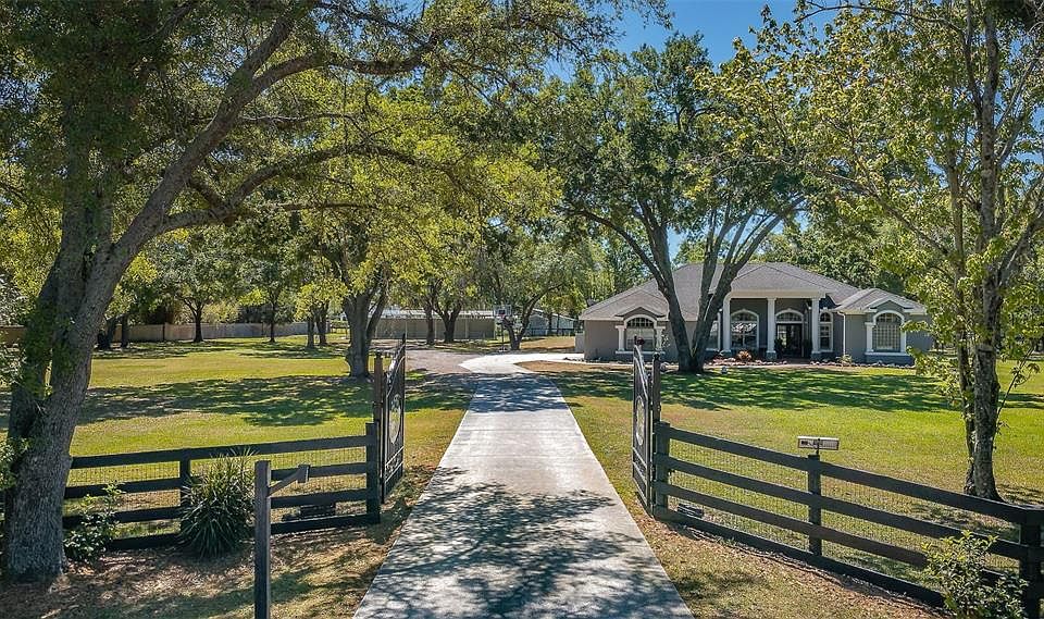 Good Morning Sunshine..Your’e going to smile everyday if you love looking out across a grassy landscape or watching your animal friends thrive. No HOA means horses, donkeys, goats, chickens birds and of course your cats and dogs have a place to live here. There is a separate dog run. If its just you then that’s ok too, the mid construction horse barn could become a large garage for your precious cars or toys. The spacious feel from the acreage brings about a big exhale and peace of mind. This open 3 way floor plan has two living areas and separate dining room space with ample room to entertain family and friends. The numerous windows and sliders allow an abundance of sunlight in. An Aquarium window overlooks the screened lanai and pool. Your private Master Suite sits on one side of the home while your family and guests may enjoy their own private time in the two extra bedrooms and full bath with door to separate the family room. Enjoy the coziness of the fireplace during the cooler weather. The three car garage has more than enough area for your vehicles and all the extras. A brand new 4 stall barn not still being completed sits on the back of the property. Add your own ideas prior to completion. The possibilities on this close to 3 acres are endless.