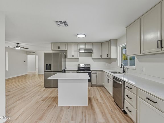 UPDATED SINGLE-LEVEL HOME WITH LARGE YARD & NO HOA! This well-built block home offers generous outdoor space in both front and back, giving you plenty of room to relax and entertain. Enjoy the convenience of an RV gate and extended covered patios perfect for outdoor living. Inside, the kitchen has been thoughtfully refreshed with quartz counters, modern cabinetry, stainless steel appliances, and warm wood-look tile flooring. Fresh interior and exterior paint, updated baseboards, and upgraded lighting create a bright, cohesive feel throughout. Ideally situated close to local schools, shopping, ASU West, and quick access to the I-17, this home combines comfort, functionality, and a fantastic location — all without an HOA!