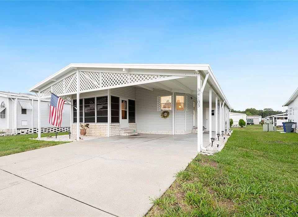 BEAUTIFUL MOVE IN READY AND FURNISHED PALM HARBOR HOME! This 2 bedroom 2 bath home is waiting for you. Enjoy this home which sits on a retention pond. This home features a separate Dining area and front screen room. Oversized storage shed and Double carport. New A/C in 2023. This home is in a great location with easy access to Wesley Chapel and Zephyrhills. All this and located in a very desirable all aged well kept family oriented community with tons of activities and great amenities some of which include 2 pools, 2 clubhouses, Shuffleboard and basketball court, fishing lake with dock and gated security and YOU OWN THE LAND.