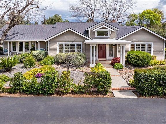 Nestled in desirable West End Ramona, this meticulously maintained home invites you to explore its serene surroundings. The charming East Coast-style estate property offers 4 bedrooms, 3 bathrooms, and sits gracefully on a sprawling 1.26-acre lot enveloped by mature trees, expansive lawns, and classic wrought iron fencing. Adorned with the character of used brick gate posts, a circular drive, and inviting covered porches, the home exudes warmth, comfort and style. Inside, discover the understated elegance of a welcoming formal entryway, hardwood flooring, plantation shutters, Pella casement windows, and single-light French doors. Bask in the backyard's park-like setting, where a lush outdoor oasis awaits with pergola and a variety of fruit trees, including apple, lemon, lime, pomegranate, and orange. Enjoy the practicality of owned solar panels, 2 Tesla backup battery walls, and a well with a 2600-gallon holding tank for irrigation. With a detached 3-car garage featuring 1 pull-through bay and an attached workshop with rear garage door access that includes 220v wiring, this home offers both comfort and potential. With the ample room on the property for RV parking, an ADU, pool or any other personal touch, embrace the tranquil beauty and endless possibilities of this gorgeous property.