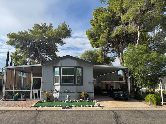Beautifully maintained 2020 two-bedroom, two-bath manufactured home located in a desirable 55+ resort-style community. This home offers an open layout with abundant natural light and modern upgrades throughout. The kitchen features a center island and updated appliances, making it both functional and inviting. Enjoy outdoor living on the large screened-in porch (approx. 200 sq. ft. per seller) overlooking a spacious lot with mature landscaping that provides privacy and a peaceful atmosphere. Recent updates include new ceiling fans, light fixtures, faucets, disposal, and locks throughout. The home also includes a fully fenced yard, perfect for pets. A three-year-old AC and heat pump provide energy-efficient comfort, and a three-year-old LG washer and dryer are included. A golf cart is available for purchase with the property. The community offers resort-style amenities, including two swimming pools, a fitness center with sauna and hot tub, a clubhouse with gourmet kitchen, library, billiards, pickleball, bocce ball, and basketball courts, along with a full calendar of activities, and much, much more. The park features beautifully manicured grounds and backs to natural desert mountain views. Call today to see this modern home, in the highly sought after community before its gone! Lot rent subject to current community rates.