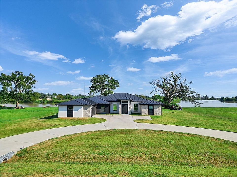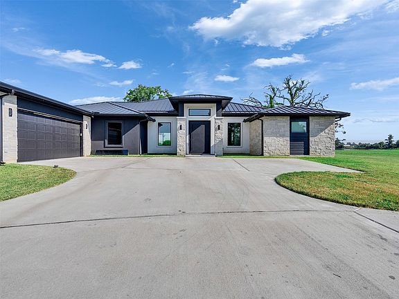 Welcome to your dream home! This exquisite, custom-built masterpiece is nestled on a picturesque 1-acre lot, complete with a charming front porch, circular driveway and metal roof. Step through the impressive pivot front door and be captivated by stunning views of the neighborhood lake and breathtaking Texas sunsets. Enjoy the added benefit of no MUD tax in this exclusive community. This home offers a thoughtfully designed split floor plan with 4 spacious bedrooms and 3.5 luxurious bathrooms. The gourmet kitchen, featuring a massive island, is perfect for culinary enthusiasts. The primary suite is a true retreat, with bi-fold doors opening to the patio and his-and-her walk-in closets. The home also includes an elegant formal dining room, soaring high ceilings, a grand foyer, and sleek sliding pocket doors in the living room that lead to a sprawling 55x11 covered patio. For added convenience, the property is equipped with a septic drip system and an underground propane tank.