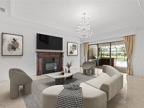 Electric fireplaceLake viewsCovered lanaiSolar-heated poolOutdoor kitchenGleaming granite countertopsHigh-end finishes