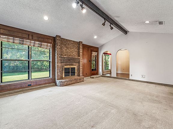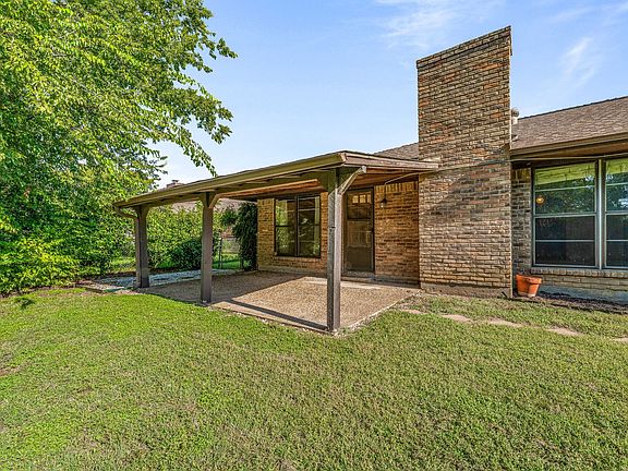 Wood-burning fireplaceFenced yardWelcoming brick-accented front entryFormal dining roomAbundant natural lightCovered back patioOversized garage