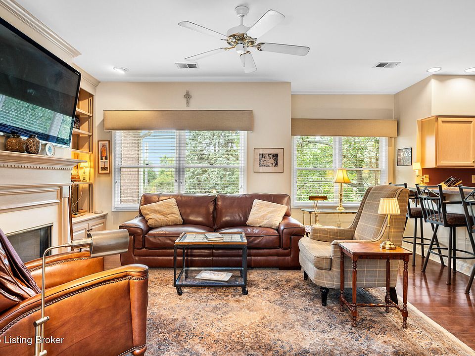 The cozy kitchen adjoins a sitting room complete with built-in bookcases and a fireplace, perfect for casual living. A large dining area opens to a spacious living room, also featuring built-ins and a second fireplace—ideal for entertaining or relaxing evenings.