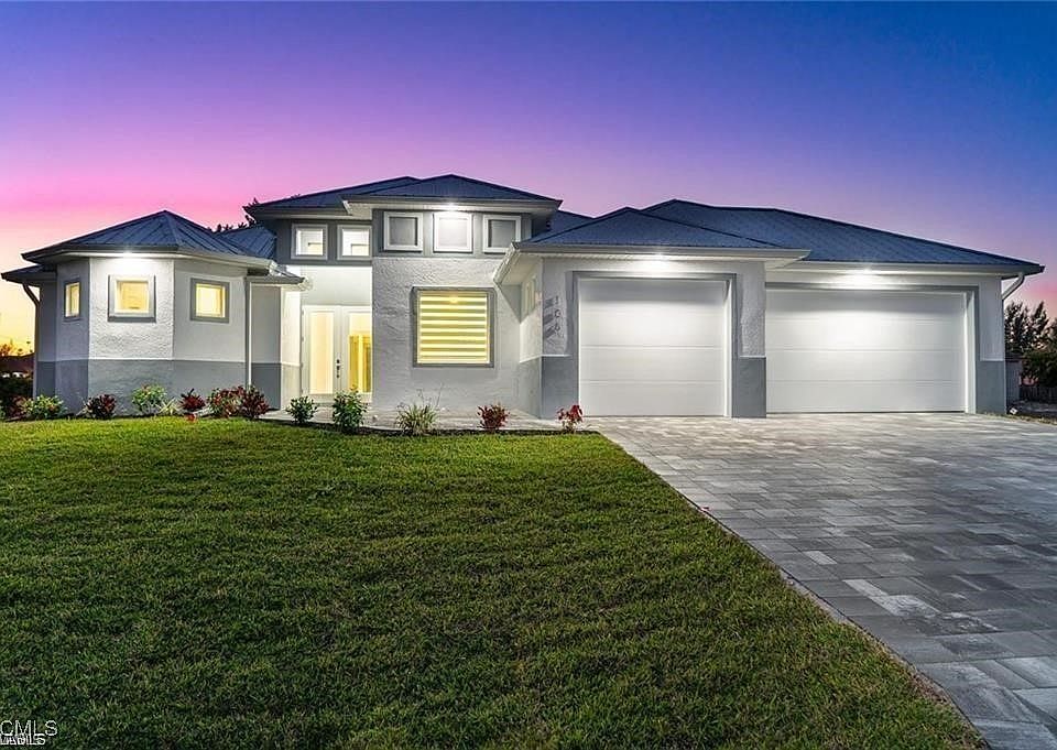 EXTRAORDINARY AND CONTEMPORARY HOME ! near a Golf Course. NO HOA , FLOOD INSURANCE IS NOT REQUIRED. Connected to city water, sewer and irrigation. This house is conveniently located off the newly widen Burnt Store Road and Embers Parkway, near Publix, Walgreens and restaurants, one of the fastest growing areas of the Cape. Open floor plan featuring 3 large bedrooms plus den and 3 beautifully designed bathrooms with upgraded tile, glass shower doors and custom cabinetry. Spacious living room opens to the kitchen and dining area. Kitchen features modern stainless steel appliances. Quartz counter tops throughout the kitchen including a waterfall countertop island, bathroom, laundry and window sills. Impact glass windows and doors throughout. Wood cabinetry and 32”x32” porcelain tile used throughout the house. Master bedroom includes his and hers walk in closets with wooden shelves in all of the closets. Living area, dining room, master bedroom, and lanai all feature captivating tray ceilings. Metal roof, insulated garage doors and LED light all around to save energy. Gorgeous lighting fixture package. Exterior soffit lighting located in the front and back of the house. Electric garage door opener, garage floor painted with epoxy. Pavers on driveway, walkway, lanai. Plenty of room for pool!