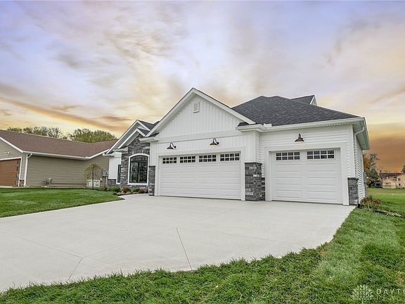 Welcome to the Melbourne design home built by Maplewood Contractors, LLC. Located in The Pointe at Indian Ridge, Piqua's premier new home neighborhood. This 2,622 sq. ft. ranch-style home with a stone and vinyl exterior offers an open-concept floor plan, perfect for entertaining guests or relaxing with family. Step through the front door into the great room, which features abundant natural light and a cozy fireplace that creates a warm and inviting atmosphere, perfect for chilly evenings. The spacious kitchen, open to the dining room, is ideal for hosting family and friends. It includes a large island, granite countertops, stainless steel appliances with a custom range hood, and a tiled backsplash. The walk-in corner pantry provides additional storage. The dining area offers access to a large covered patio, and an extra concrete slab provides even more space for seating and cookouts. The first-floor primary suite features a luxurious bathroom with Craftsman-style finishes, custom-built dual vanities with additional storage cabinets, a zero-entry tiled shower, and a separate toilet closet. The walk-in closet offers plenty of extra storage space. Two additional bedrooms share a hall bathroom, and one of the bedrooms features vaulted ceilings, perfect for a home office. Upstairs, you'll find a fourth bedroom, a full bathroom, and a spacious recreation room, ideal for entertaining family and friends. A separate mudroom and laundry room are conveniently located on the main floor. The oversized three-car garage provides ample space for vehicles and extra storage.
