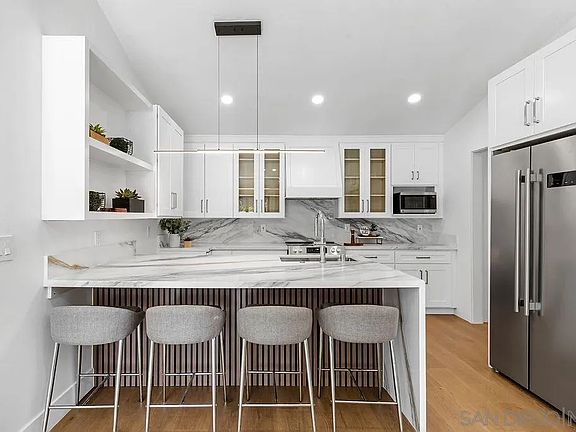 This thoughtfully updated 3-bedroom, 2-bath residence in the heart of Clairemont has been completely reimagined with high-end upgrades, modern finishes, and custom craftsmanship. Ideally located near Mesa College, it offers the perfect balance of style, comfort, and convenience. The spacious open-concept kitchen and living area extend effortlessly to the outdoors through dramatic accordion-style glass doors, capturing the essence of Southern California indoor-outdoor living. The chef’s kitchen showcases quartz countertops, a large island, premium stainless steel appliances and custom cabinetry. A bright, inviting living room with a cozy wood-burning fireplace provides the ideal space for both relaxation and entertaining. Elegant engineered wood flooring, a brand-new washer and dryer, and central air add to the home’s comfort and appeal. Step outside to a private backyard retreat featuring a sparkling pool and spa, an outdoor dining pavilion with built-in BBQ, lush landscaping with mature fruit trees, and sweeping canyon views. A spacious covered patio and energy-efficient solar system complete this exceptional property.