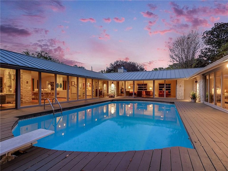 SPECTACULAR Mid-Century Style home on almost an acre of heavily treed property. Quiet, PRIVATE, cul-de-sac with plenty of parking. This home was design for large family gatherings and ENTERTAINING IN MIND. Most of the rooms overlook the 10' deep oversized diving pool. 3 large living areas with 2 fireplaces. Standing seam roof was installed 1/11. A MUST SEE to BELIEVE!!!