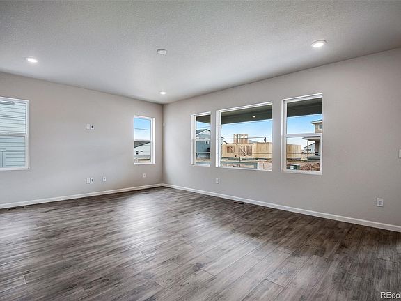 Meticulously designed, this home includes elegant details like a vertical wood railing, luxury vinyl floors with a wide plan 'wood look' throughout the main living area, and stylish black plumbing fixtures create a cohesive and welcoming ambiance. The well-planned layout showcases a roomy kitchen adorned with sleek grey cabinets, white quartz countertops, and stainless steel appliances, including a gas range, microwave, and dishwasher. Plus, enjoy extra space to spread out in the finished basement with a recreation room, bedroom, and bathroom. The primary bathroom features a spacious walk-in shower with sophisticated marble-look tile, chic tile flooring, and white quartz countertops. Step outdoors onto the expansive covered patio or the covered porch, providing an ideal space for enjoying the fresh air. With the added convenience of air conditioning, this residence effortlessly blends modern luxury with practical functionality. Located in the amenity-rich community of The Aurora Highlands and bustling with activity. the event lawn is now open, along with public art displays. Plans are underway for a Beach Club with community pool, miles of trails, numerous neighborhood parks - including playgrounds and athletic fields - and the expansive Hogan Park at Highlands Creek. The Aurora Highlands also hosts numerous community events throughout the year for its residents such as an Independence Day Festival and a summer Artisan market.