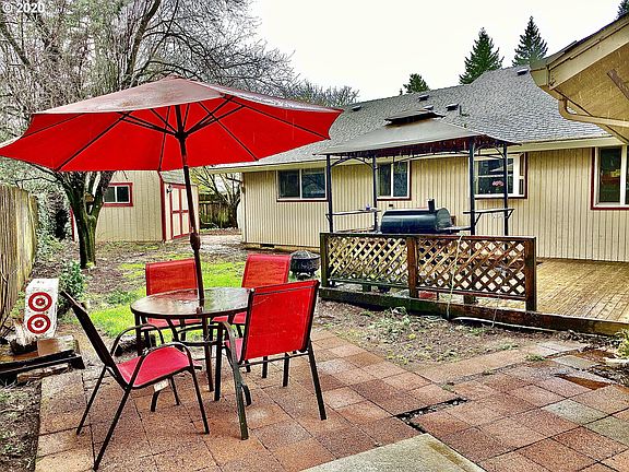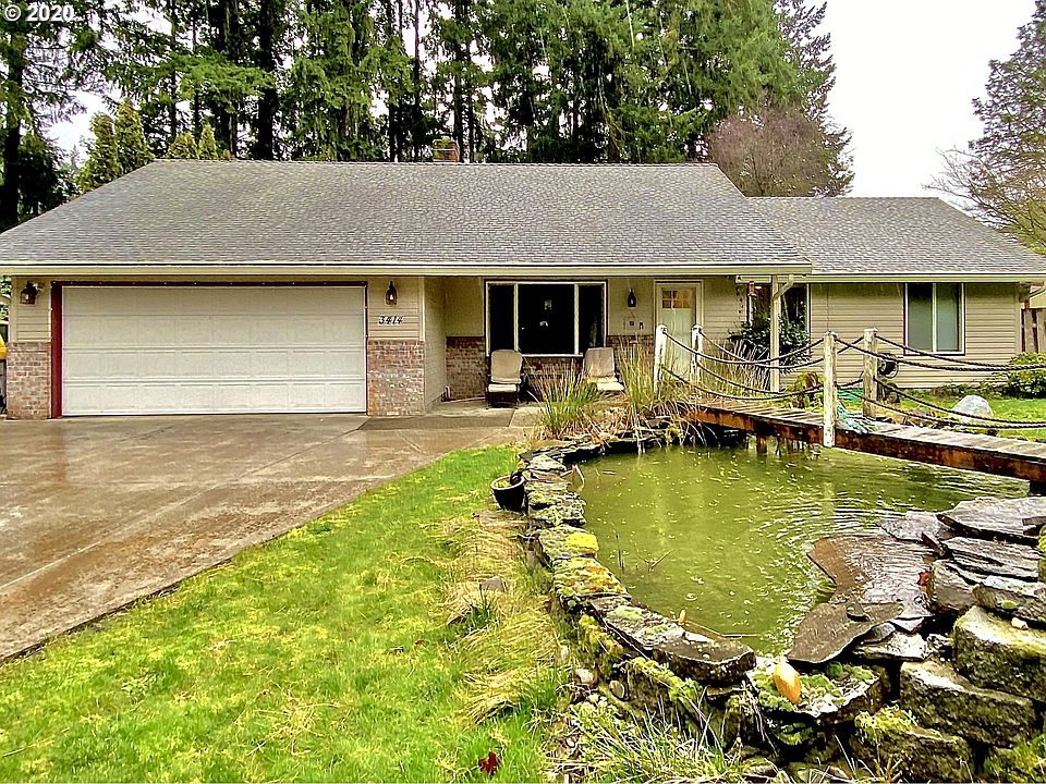 Enjoy this large corner lot and the privacy of tranquil landscape and pond. This 3 bedroom one level has had quite the upgrade. With an added family room and pass through bar, an upper bedroom over the garage, and amply sized kitchen. Freshly painted walls new carpet and updated flooring throughout the home. Laundry is ready for a shower or dog wash and there are 2 storage areas outside. Enjoy separate space with the office shed in the rear and sit out front and unwind with your water feature
