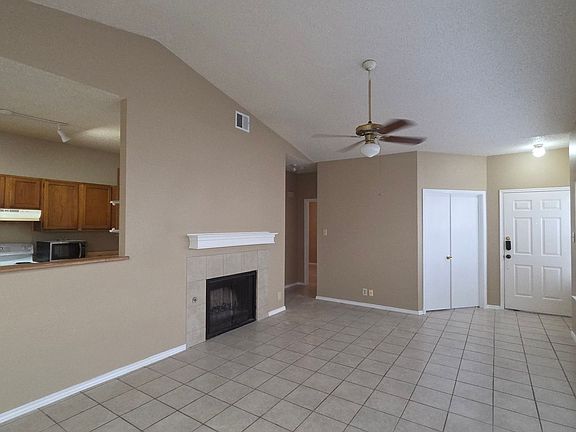 Well-maintained 3-bedroom, 2-bath duplex with a 1-car garage, tucked away with rear entry for added privacy. This home offers an open living and dining area with vaulted ceilings, tile flooring throughout, and a wood-burning fireplace that anchors the main living space. Two ceiling fans and neutral finishes keep the interior light, comfortable, and easy to furnish.