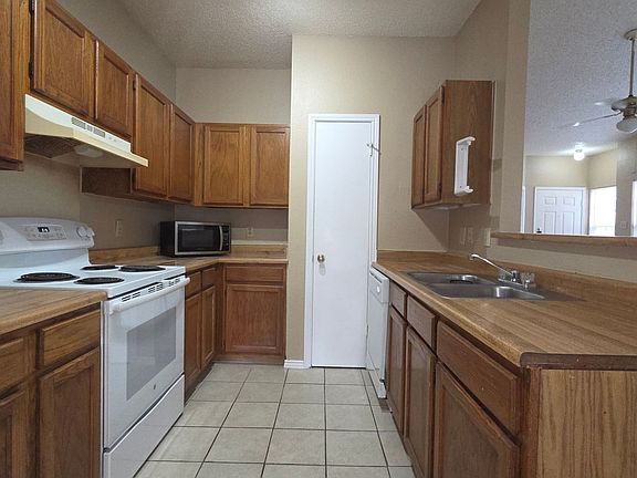 The galley kitchen features generous wood cabinetry, laminate countertops, electric range, vent hood, and a double-basin sink, with direct sightlines to the dining area. The split bedroom layout provides separation between the primary suite and secondary bedrooms. Both bathrooms offer ample cabinet storage and tub/shower combinations.