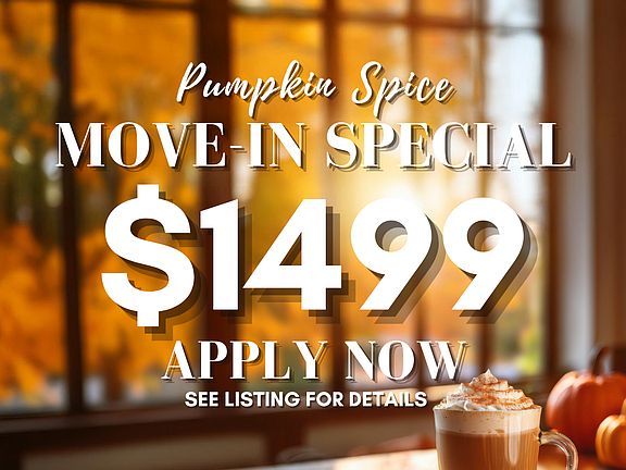 Ready for Immediate Move-In! PUMPKIN SPICE MOVE-IN SPECIAL! $1499 MOVE-IN, if moved in on or before 11/27/2025 (latest possible move-in date)! Move-In special includes the refundable security deposit, admin fee and ONE WEEK FREE RENT! Prorated rent is due one week after move-in! 1st full month of rent is due on DEC 1ST! (Animal fees are not included in this move-in special and are due at move-in if applicable)