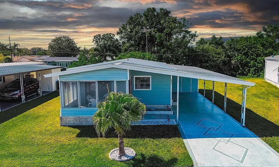 Welcome to a place where charm meets easy living — 3415 Chatford Drive is partially furnished, double-wide manufactured home that redefines what it means to live comfortably and effortlessly. If you’ve been dreaming of a move-in ready home that wraps function and personality into one beautiful package, this is it. From the moment you arrive, the inviting curb appeal sets the tone. The home is perched on a landscaped lot, offering tranquility on a quiet street paved for easy strolls or golf cart cruises. A screened front porch welcomes you like a warm hug — imagine sipping morning coffee here while Florida sunshine filters through mature landscaping. It’s peaceful, it’s private, and it’s pure lifestyle. Step inside and be surprised. This home may have been built in 1979, but the feel is fresh and clean, . With 768 square feet of heated space and over 1,400 square feet total, every inch has been maximized for comfort and flow. The open layout is anchored by a cozy yet spacious living room that’s dressed in soft carpet, making it the ideal place to unwind or host casual get-togethers. Right next to it, the dedicated dining area features laminate flooring that seamlessly connects to the kitchen, creating a space that feels both intimate and open. The kitchen is smartly designed — compact but efficient, with room to move and cook. Appliances including a range, refrigerator, and washer/dryer are all included, making it truly turnkey. Everything is connected, convenient, and ready to go. The L-shaped dining space adds flexibility for anything from formal meals to quick breakfasts on the go. Two bedrooms await at the back of the home, both with laminate floors and built-in closets that maximize space without sacrificing style. The primary bedroom is generously sized and located on the main floor, making single-level living an easy win. A full bathroom and an additional half bath mean no waiting in line — because comfort is all about the little things. And while it’s easy to fall in love with the inside, don’t overlook the lifestyle waiting outdoors. for lazy afternoon lounging and a front porch perfect for neighborly hellos. A shed in the back offers extra storage for tools, seasonal items, or hobby gear. There’s no garage, but you’ve got covered carport parking for two vehicles. Comfort meets practicality with central heating and air, and public utilities including water, sewer, and electricity already connected. And let’s not forget those extra perks that take it to the next level — ceiling fans, window treatments, and hurricane shutters are already in place, giving you peace of mind and easy living from day one. This is a home that lives bigger than its square footage. It’s in a community where ownership includes access to a clubhouse, pool, recreational facilities, and even wheelchair-accessible amenities. Whether you’re looking to downsize, snowbird, or just simplify, this property delivers a sense of place and possibility. And the best part? You don’t have to lift a finger. This home is complete, connected, and waiting. Everything’s already here. All it needs — is you. Ready to make the move? This is the one.