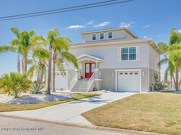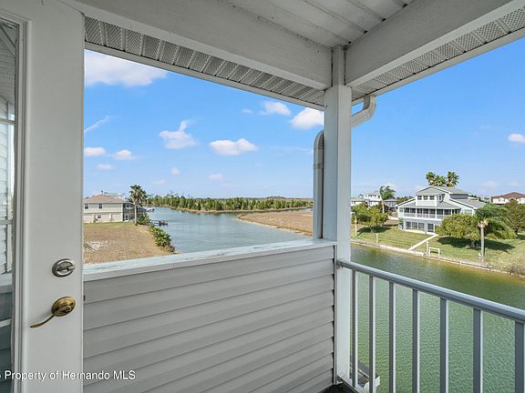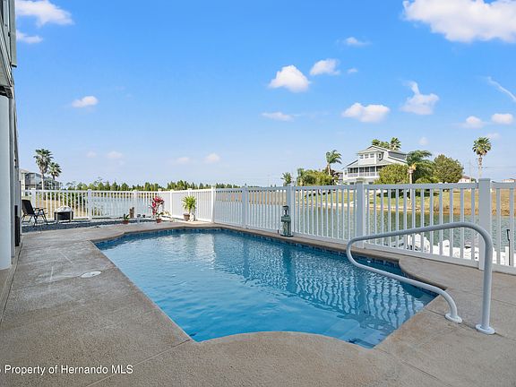 Stunning Waterfront Oasis and Coastal Elegance! Welcome to your dream home in Hernando Beach, boasting three stories of LUXURY LIVING. This three-bedroom, two-bath meticulously maintained gem features SOLID WOOD FLOORS and Bahama Shutters throughout, a NEW ROOF (2023), and NEW HURRICANE RATED WINDOWS (2023) Wired for a generator, Hurricane shutters on the front door, hurricane braces on garage doors this home ensures preparedness during any weather for peace of mind. Enjoy the allure of tropical curb appeal with a NEWLY SURFACED POOL (2022) surrounded by PALM TREES. The HEATED POOL, Floating Dock, 75ft of seawall with approximately a 4ft knee wall with solar lighting, 2 FISH CLEANING STATIONS, a VINYL FENCED backyard with solar-lit toppers and an exterior shower on the lanai invite you to relish waterfront living. On the main living you will find an open living room seamlessly connects to a SCREENED LANAI overlooking the water which can also be view from the open Kitchen which is a culinary delight with stainless steel appliances, GRANITE countertops, and a walk-in pantry. The spacious dining room flows seamlessly into the family room with a TRIPLE SLIDER to a screened porch, providing a perfect setting for relaxation. The primary suite on the THIRD FLOOR treats you to a WET BAR/COFFEE BAR, FRENCH DOORS leading to a covered balcony offering breathtaking non-obstructed view of the Gulf and Wildlife Preserve The primary bathroom features a jetted tub, walk-in shower, and double sinks, while a walk-in closet with ample storage, and motion lights to create convenience. Multiple staircases lead to the garage area, equipped for vehicle storage and space for kayaks, boats, paddleboards, and more, with EPOXY FLOORS adding a touch of elegance. This home provides not only a haven of tranquility but also convenient access to restaurants, entertainment, and waterfront activities. Immerse yourself in the beauty and waterfront lifestyle of Hernando Beach - your tropical paradise awaits!
