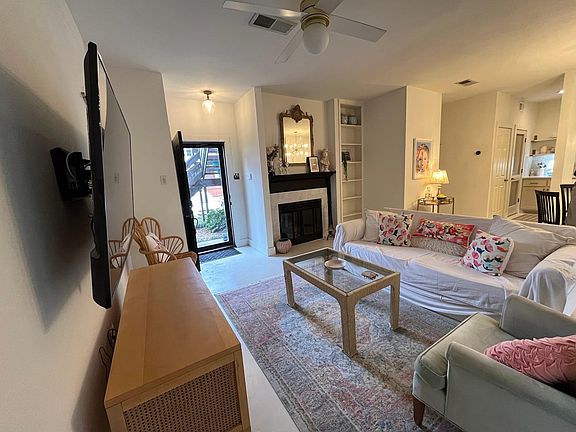 Working wood-burning fireplaceHigh ceilingsDesk for remote workBuilt in bookshelvesQuartz countertopsGated entranceSmart tv