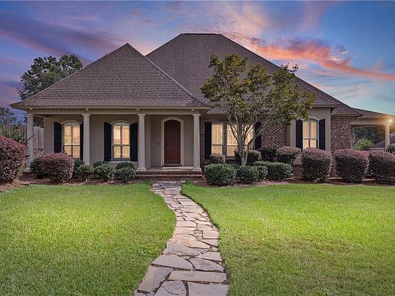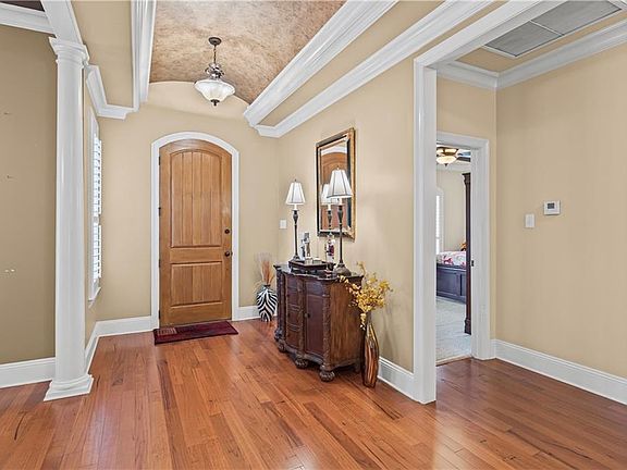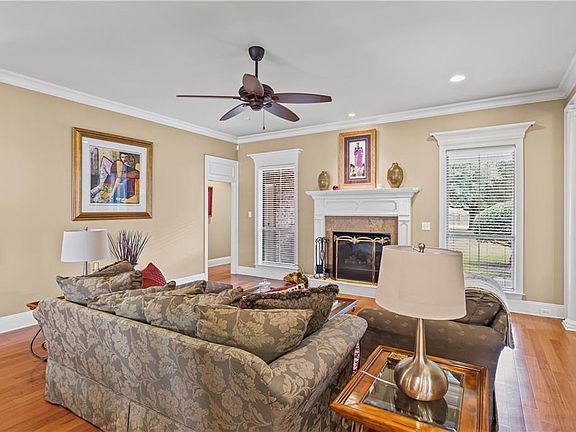 VALUE RANGE PRICING: SELLER WILL CONSIDER OFFERS BETWEEN $584,000 AND $610,000. Elegant French Provincial Home on Expansive Lot! This stunning 4-bedroom home offers timeless design and modern luxury all on one level, plus a versatile flex space over the 3-car garage—perfect for a guest suite, office, gym, or 5th bedroom. Freshly painted inside and out, the home features beautiful arched windows, plantation shutters, heavy crown molding and custom cabinetry throughout. A true chef’s kitchen opens to a cozy keeping room with French doors leading to the side porch, ideal for morning coffee or evening relaxation. The split floor plan offers a serene primary suite with a spa-like bath including a Jacuzzi tub, separate shower, and large walk in closet. The additional bedrooms share a spacious full bath with double sinks. The covered back porch is perfect for entertaining, complete with surround sound and a gas hookup for grilling. Sitting on nearly an acre (.83), this home also includes recessed lighting in the eaves, a 3-car garage with almost 1,000 sq ft of space, and endless curb appeal.