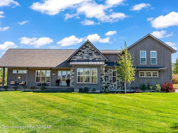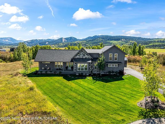 Discover this custom-designed modern farmhouse nestled in the prestigious Hiddenwaters community. Perfectly positioned on a generous 0.70-acre lot, this home offers unmatched privacy and sweeping views of Teton Valley and the Impressive Teton Range. With close access to multiple trailheads entering Caribou-Targhee National Forest, your backyard becomes a gateway to endless outdoor adventure. Step inside to breathtaking cathedral ceilings, clean architectural lines, and refined finishes that create a sophisticated yet welcoming atmosphere. The open-concept layout flows effortlessly between living, dining, and kitchen spaces, ideal for both intimate evenings and elegant entertaining. This opulent kitchen features premium appliances, granite countertops, custom cabinetry, a pantry, and a spacious island with seating. Retreat to the luxurious main-level primary suite, complete with a spa-inspired bath with In-floor heating and expansive walk-in closet. Upstairs, additional bedrooms include a private in-law suite with its own entrance and full second kitchen, perfect for guests.