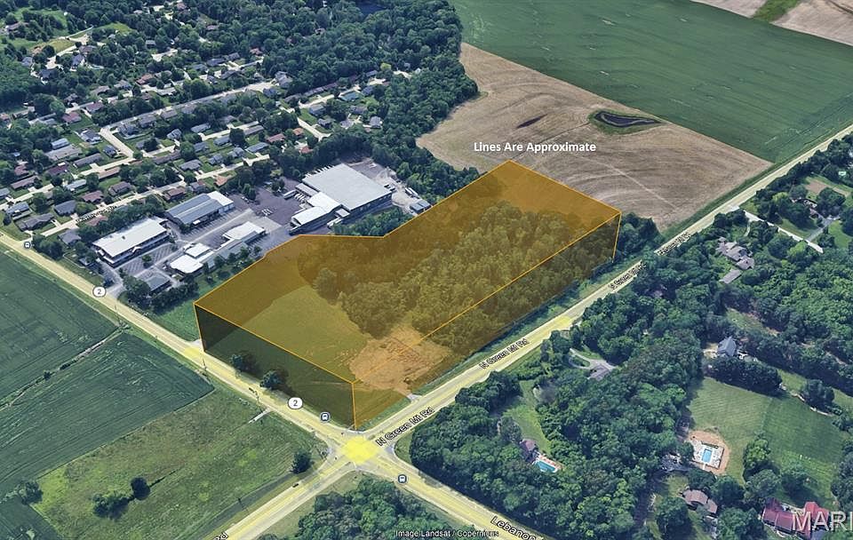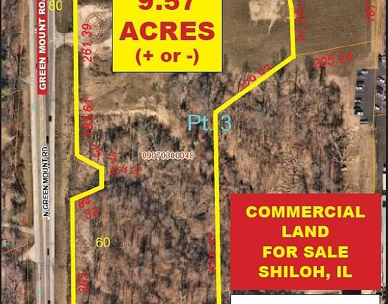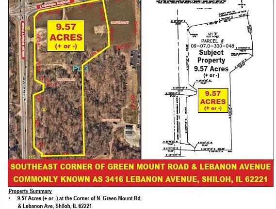Outstanding Commercial Development Opportunity! 9.57+/- acres located at the signalized corner of N. Green Mount Rd. & Lebanon Ave in Shiloh, IL. Zoned General Business (B-4) with approx. 925’ of frontage on Green Mount and 482’ on Lebanon. Excellent visibility with high traffic counts—over 27,000 vehicles daily. Just 2 miles from I-64 (Exit 16) and minutes from Scott AFB. Surrounded by retail, healthcare, and residential growth. Ideal for retail, gas station, medical, or mixed-use development. Sale Price: $1,895,000.