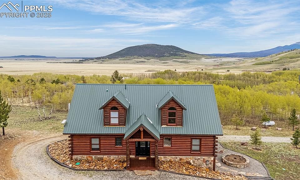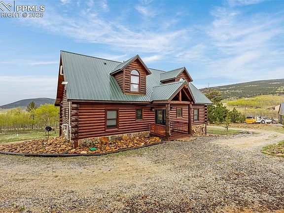 ASSUMABLE LOAN. Welcome to this exquisite four-bedroom, five-bathroom mountain estate, a true masterpiece of rustic elegance-once showcased on HGTV’s Log Cabin Living. Nestled on two private acres within the prestigious, gated Warm Springs Ranch community in Fairplay, this stunning log home offers the perfect blend of serene seclusion and elevated mountain living. 40 MINUTES FROM BRECK! Crafted from authentic log construction and adorned with striking beetle-kill pine ceilings and walls, the home welcomes you with warmth, character, and refined craftsmanship. The soaring two-story great room commands attention with its dramatic floor-to-ceiling stacked stone fireplace, expansive windows, and skylights that bathe the interiors in natural light. The gourmet kitchen features a generous center island with bar seating and prep sink, sleek stainless steel appliances, gorgeous custom crown molding cabinets, and walk-in pantry. Step from the dining area onto the expansive covered deck with breathtaking alpine vistas and surrounding views. The main level offers two bedrooms (one non-conforming) and two full baths (one with steam shower/aroma smells). Upstairs, a versatile loft space. Ideal for a reading nook, study, or yoga retreat. The luxurious primary suite is a true sanctuary, complete with vaulted wood ceilings, a cozy gas fireplace, panoramic windows, spacious closet, and an indulgent five-piece spa bath featuring a soaking Microsilk tub, custom-tiled shower, and dual vanities. Downstairs, the walkout basement includes family room with a third fireplace, custom built-ins, and space for a billiards table. Two additional en-suite bedrooms ensure comfort and privacy for every guest. The lower-level deck with hot tub creates a perfect après-ski retreat under the stars. Additional highlights include dual-zone heating with two NEW tankless water heaters, NEW humidifiers, dual steam showers, fresh cheeking, fresh staining, and an irrigation system.