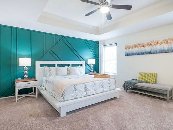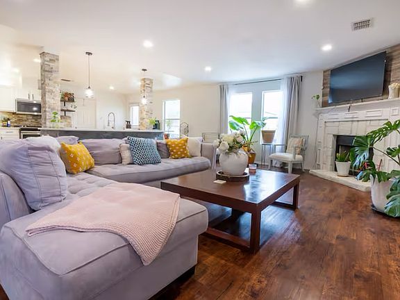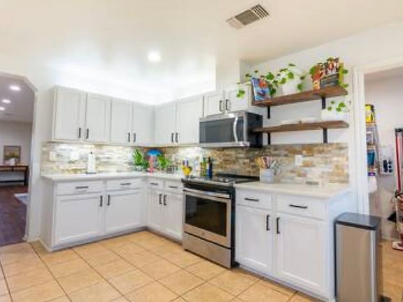 Highlights: This stylishly renovated home is located at 3418 Longhorn Creek, San Antonio Tx 78261. It features a contemporary kitchen with stainless steel appliances, quartz countertops, and a stone backsplash. The bathrooms are updated with modern tile designs and fashionable fixtures. The kitchen includes a cozy eat-in area with barstools and a sophisticated dining room table. All bedrooms are furnished with trendy bedding and decor. There is spacious walk-in closets in two of the rooms and regular closets on the other room. The backyard boasts a large covered patio with a dining set perfect for enjoying the outdoors.