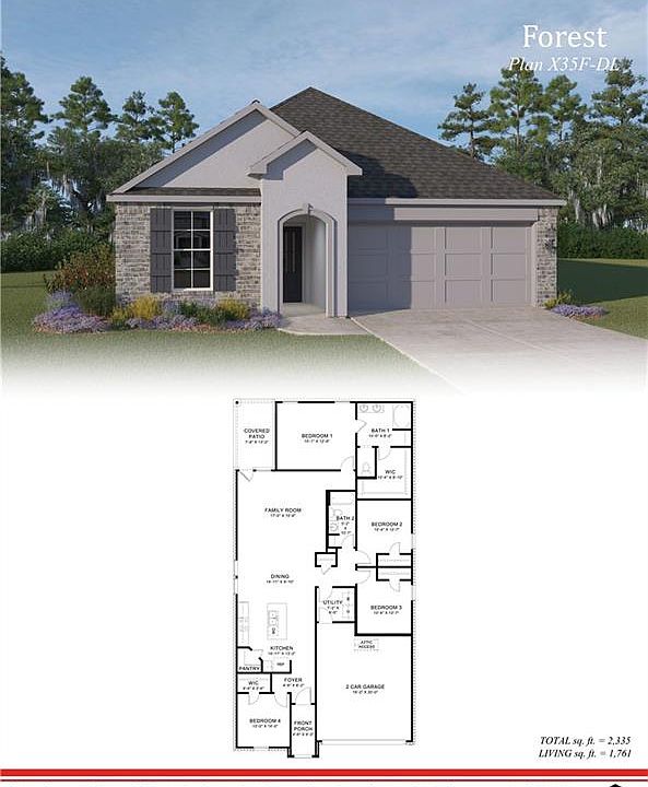 The Forest is a new spacious one story plan with an open floor plan, and a large island open to the family room and breakfast area. Great for entertaining and making lasting family memories. This home boasts lots of room for your family with4 bedrooms, 2 full bathrooms. The kitchen features stainless appliances and a gas range, and a corner pantry.
