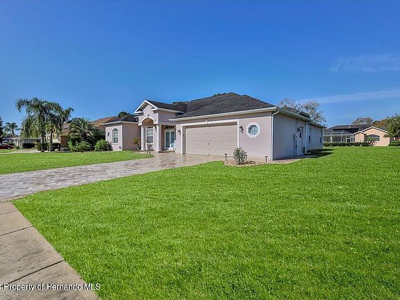 Form meets function in this timelessly elegant pool home! Sitting on a large lot in gated Pristine Place, this beauty has incredible curb appeal from the pavered driveway to the manicured landscaping. A wide foyer with a custom tile mosaic awaits through double doors. The attention to detail is evident in architectural elements like high ceilings, crown molding in key places, and arched entryways. There's space to host everyone for dinner parties and get-togethers in your formal dining and living rooms; the coffered ceiling in the living room compliments the gleam of the laminate flooring, too. A den just off the front entrance adds flexibility to the floor plan. Grab your favorite Western or mystery novel and curl up for a good read, or transform it into a home office, playroom, or 4th bedroom. Illuminated with LED lighting, the bright kitchen is the heart of this home with lovely granite counters, a built-in oven and microwave, and an electric cooktop. Sip your morning coffee or tea at the breakfast bar, or nibble on your bagel at the eating nook, which overlooks the pool area and backyard. Whether it's time for a round of Twister on game night, or you're streaming the latest episode of The Last of Us, the spacious family room with its vaulted ceiling is the perfect place to relax with your nearest and dearest. And when it's time to wind down at the end of a long day, the split bedroom floor plan ensures that the master bedroom is your very own refuge. It boasts a tray ceiling, private access to the lanai, and enormous his-and-her walk-in closets. The ensuite master bath features a granite-topped dual sink vanity, large garden tub, and a walk-in shower. The other three guest bedrooms are quite sizable so that family or visitors can rest comfortably. They share a guest bathroom with a granite-topped vanity pool access. Besides transitional entry from the garage, the indoor utility room provides additional storage in the form of a huge walk-in pantry. Snag a towel and some sunscreen before you head through glass sliding doors to the shady lanai; cool off with a tasty umbrella drink under the ceiling fan after you've caught some rays on the pavered deck. You can soak your stress away in the bubbling spa, or when it's time to cool down, splash down into the pool and swim to your heart's content. Pristine Place is a delightful gated community with a clubhouse, fitness center, community pool, playground, and more. It's not far from the Suncoast Parkway for easy access to Tampa and its amenities, including the international airport. You're within 2 miles of not one, but 2 of the county's magnet schools: Powell Middle School and Challenger K-8. You're only minutes away from Veterans Memorial Park with its popular lighted walking trails, as well as Anderson Snow Park with its amazing sports complex and athletic fields. Weeki Wachee Springs State Park and other popular swim destinations like Rogers Park and Pine Island are only a short trip to the west. There are a plethora of shopping, dining, and entertainment options nearby, including locally-owned favorites like Rookies Sports Bar and Grill, Rice and Beans, Tidal Brewing Company, Bagels and Beyond, and so much more. Do not miss out on your opportunity to live the Florida lifestyle you've always wanted; schedule your appointment to view today!
