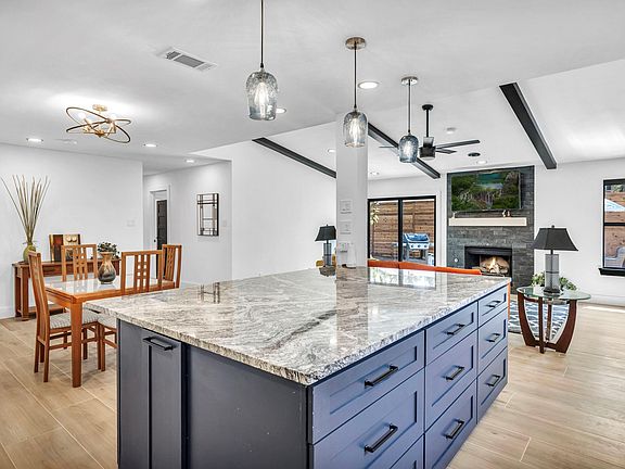 - Beamed Ceilings, Breakfast Bar, Ceiling Fan(s), Kitchen Island, Open Floorplan, Primary Bedroom on Main, Stone Counters, Storage, Vaulted Ceiling(s), Walk-In Closet(s)