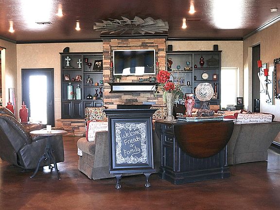Stunning, breathtaking, gorgeous, unique, one-of-a-kind!!! Take a look at this property! Custom at its finest, this home has specialty finishes on all walls and ceilings, granite, crown molding and beautiful stained concrete floors with borders and stamped medallions. Open concept plan as you walk in the front door. The family room sports a beautiful stone fireplace with built-ins. A cozy place to unwind, the wine tasting room is just off of the family room. Fantastic for entertaining, the kitchen has a large bar, more storage, double ovens, gas cooktop, double refrigerator and the laundry/pantry is adjacent with more serving areas, room for freezers, and a sink. The home office has wood ceilings with windows that overlook a nice view. 5 bedrooms and 2 baths will amaze you with beautiful finishes and unique touches. The large master en suite has Venetian plaster on the ceiling, a huge closet with built-in drawers, cabinets and shoe storage. More comments in Private remarks.