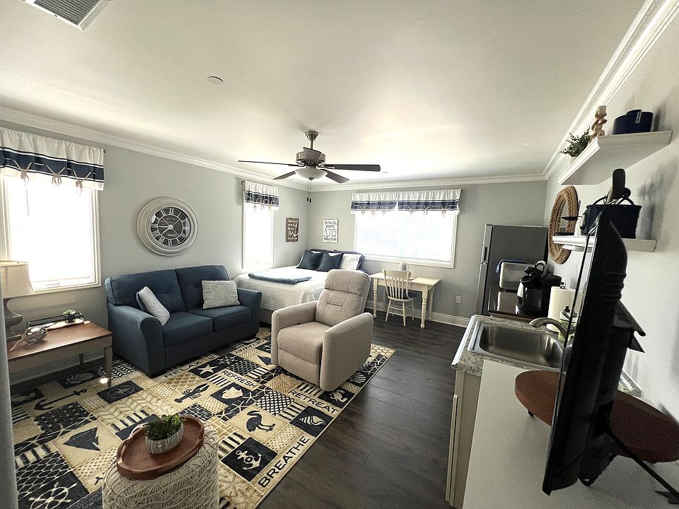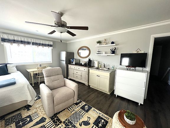 Fully furnished and decorated Studio Apt. This unit is a must-see! It has a large living rm/dining area and a kitchenet. There is a large bathroom including double sink, shower/bath combo and decor. The unit is furnished with a queen-size bed, including quilt, and living room/ dining room furnishings and decor. There is a large closet with a dresser and a set of shelves for pantry goods and still plenty of room for hanging clothes. The kitchen has a sink and garbage disposal, microwave/confection oven combo, single cook top, toaster, Keurig and a refrigerator. Note: there is not a traditional oven or stove. The unit is stocked with 4 place setting of dishes, silverware, and some utensils. It is also stocked with some towels. There is a large washer/dryer combo unit. There is a private entrance with a security gate. The unit has its own thermostat for forced heat/air conditioning. The unit is located in a beautiful quiet neighborhood. It is walking distance to the beach, park, Main St., many restaurants and the grocery store.