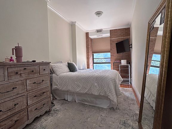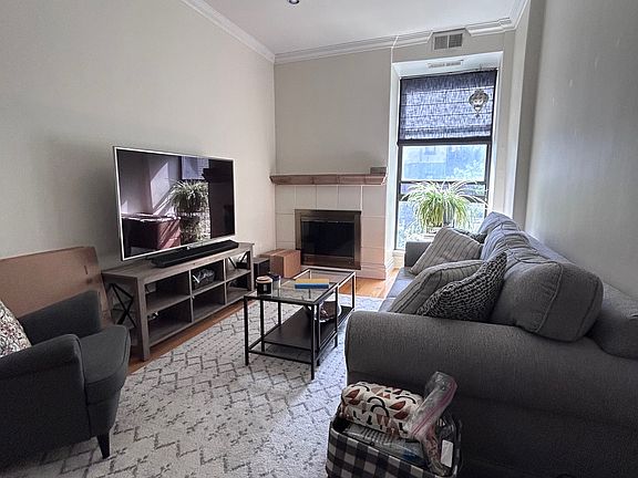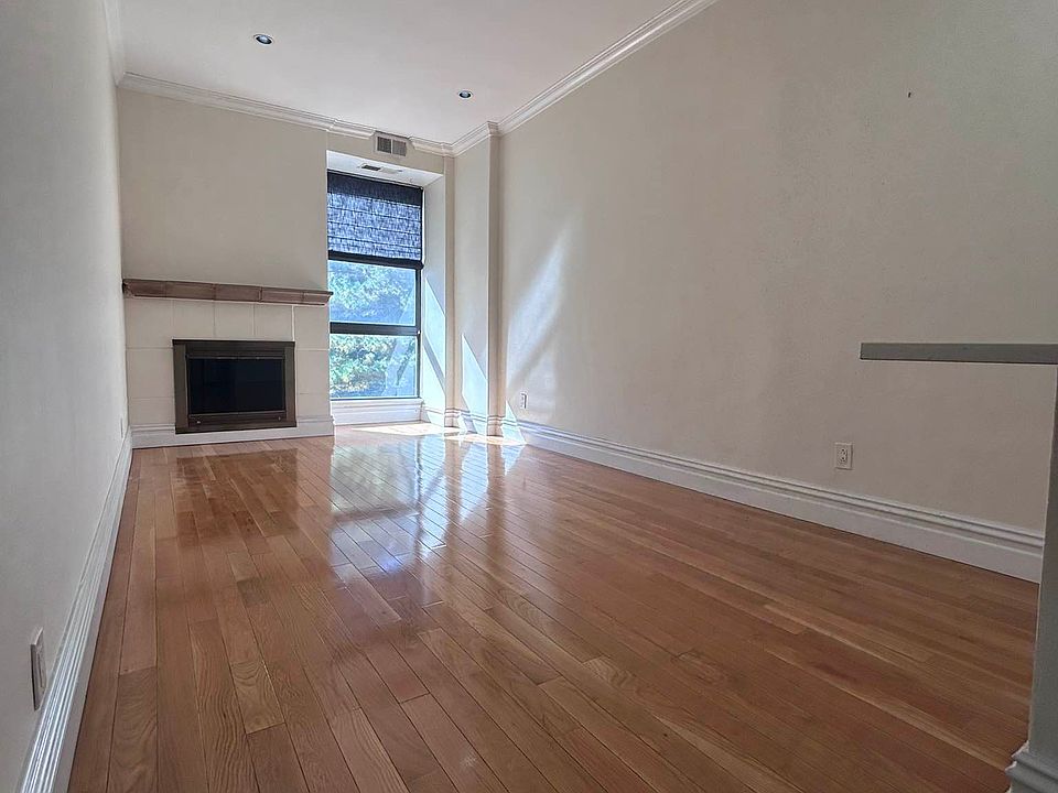 Floor-to-ceiling windows facing southDecorative fireplaceCentral airWell-maintained walk-up buildingLarge marble bathroom