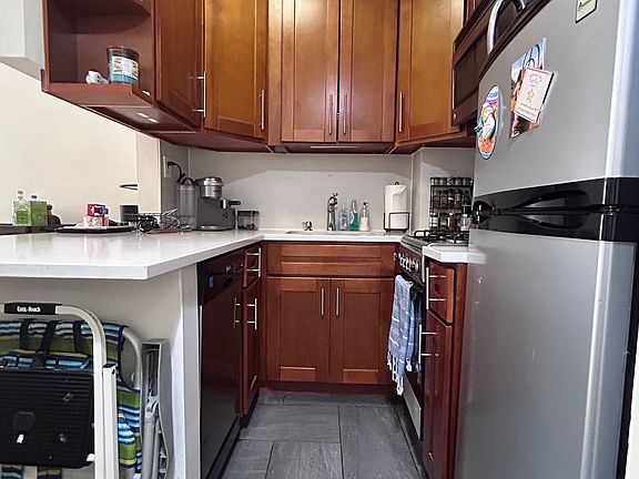 -Open kitchen equipped with ample wood cabinetry and stainless steel appliances with a dishwasher