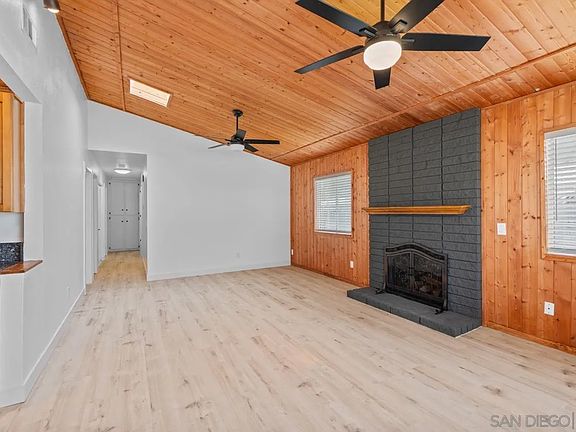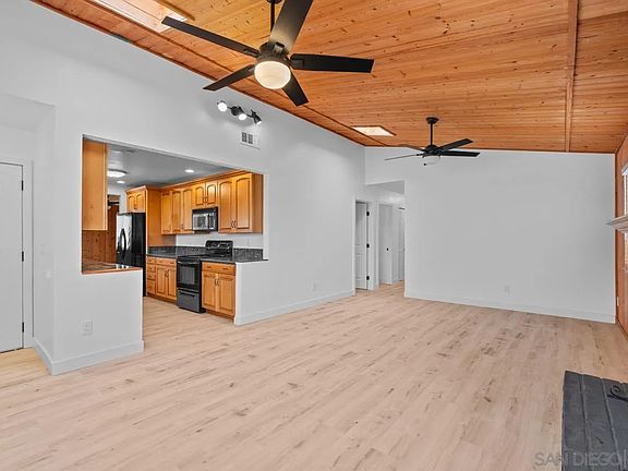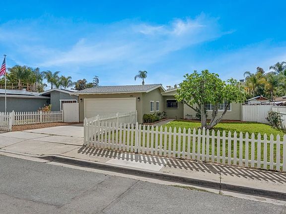 Welcome to this beautifully updated 4-bedroom, 2-bathroom home in Ramona, CA! The white picket fence & green lawn will immediately welcome you home. You'll find fresh paint inside & out, brand-new luxury vinyl plank flooring, all new modern light fixtures, refreshed bathrooms, a tastefully designed kitchen, & enclosed sun-room. The living room impresses with vaulted wood ceilings & a modern fireplace. Each bedroom has been remodeled with new mirrored closet doors & the primary suite is spacious with private access to the backyard via new French doors. The large backyard is ideal for gatherings, gardening, or simply enjoying . An attached 2-car garage provides ample storage & parking. The solar system provides energy cost savings! Whether you're looking for space to spread out or a quiet retreat from the city, this home has it all. Don’t miss this rare opportunity for a taste of rural living, while keeping you close to shopping, dining, & every-day conveniences.