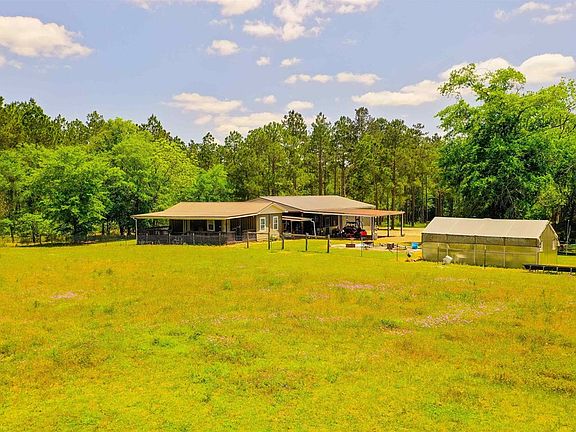 A Modern Ranch on 10 acres is the perfect country living escape! Fenced paddocks for livestock and chickens, a small irrigated field and a large 40x80 covered Equipment/RV/Boat shelter are also part of the package. Enter the home through the great room which features an open kitchen concept with a large island, pantry, and a full bath nearby. The master suite features a very generous tiled bathroom with a zero entry oversized shower with a walk-in closet/laundry room combo, as well as a separate office and private screened porch. The 2 guest bedrooms share a bathroom and kitchenette. A covered porch provides views of the irrigated field that would be ideal for planting blueberries or seasonal crop. Has additional acreage that can be purchased.