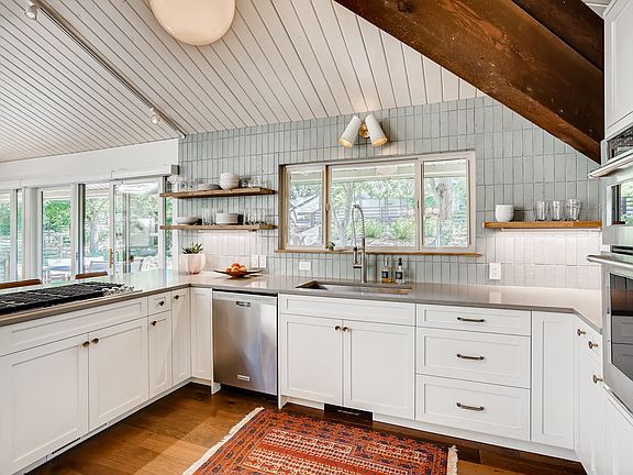 Extensively remodeled in 2021. Alpine modern style with vaulted ceilings and beams throughout. Main room with gas burning fireplace is open floor plan with skylights, windows on all sides and includes living, dining, kitchen and music rooms. Office just off main living area. Oversized sliding doors to front patio with fire table. Deck with hot tub. Two primary bedrooms (kings) each with private bathroom. One on upper level. One on lower level with deck and patio opening to back yard. Two additional bedrooms (queens) with one shared bathroom in daylight basement. Private fenced front yard and back yard. Located on a quite dead-end street next to open space and two trail heads to all of the Flatirons trails. Two car garage. Fully furnished.
