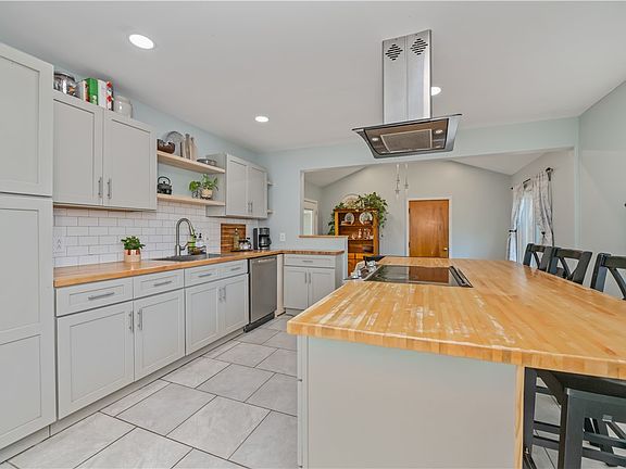Gorgeous 3 bedroom, 1.5 bath ranch that perfectly blends charm and modern style! Step inside to find gleaming hardwood floors flowing throughout the main level and a stunning full kitchen remodel (2019) featuring gray cabinetry, a huge island with seating, subway tile backsplash, butcher block countertops, stainless steel appliances, and tile flooring — the ideal space for cooking and entertaining.
