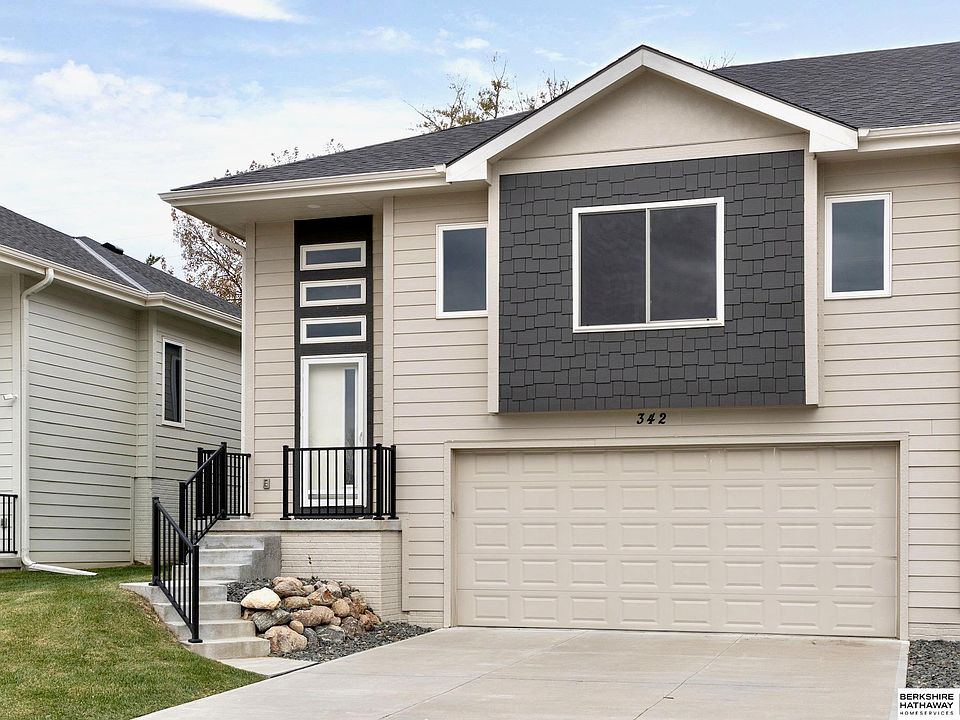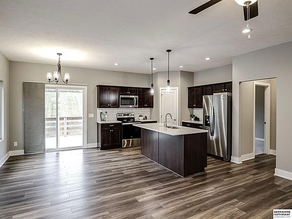 SMALL TOWN CHARM MEETS MODERN, MOVE-IN READY! Don't miss your opportunity to enjoy the charm of small town living coupled with the convenience of new construction! Situated on a quiet street in the new Prairie Hollow development, this NEARLY new, 3-bed, 3-bath, split entry home in the heart of Bennington awaits its new owner. Step inside the two-story entry and enjoy cathedral vaulted ceilings, LVP flooring on the main & an electric fireplace. The open floorpan creates plenty of entertaining space in the gorgeous custom kitchen, complete with center island, birch cabinets, quartz countertops, & stainless steel appliances. Plus, an informal dining space with a sliding door to your deck and fenced backyard! Enjoy laundry room, primary w/ en suite, and 2nd bed/bath all on the main. The lower level incudes additional rec room space, 3rd bedroom, 3/4 bath, and spacious 2-car garage! HOA includes snow, lawn, trash & common areas. Walk to local restaurants, schools, retail, parks & more!