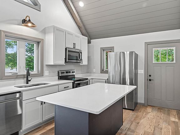Built in 2023, this inviting lakeside home on the shores of Paulsen Lake offers comfort, style, and beautiful water views. Featuring 2 bedrooms, a full bath, and an additional loft space ideal for extra sleeping accommodations, the home is designed for both relaxation and entertaining. Large vaulted ceilings and expansive windows fill the interior with natural light while framing views of the lake. The kitchen is equipped with stainless steel appliances and solid surface counters, combining function and modern appeal. In-floor and forced-air heat provide year-round comfort. Step outside to a spacious patio overlooking the water—perfect for morning coffee, evening gatherings, or simply enjoying the peaceful setting. A dock is included for easy water access, and a storage shed keeps lake toys and yard equipment organized. Paulsen Lake allows motorized boats but maintains a no-wake policy, ideal for fishing, kayaking, or leisurely cruising. Whether for seasonal getaways or year-round living, this property offers a rare chance to enjoy lake life at its best.