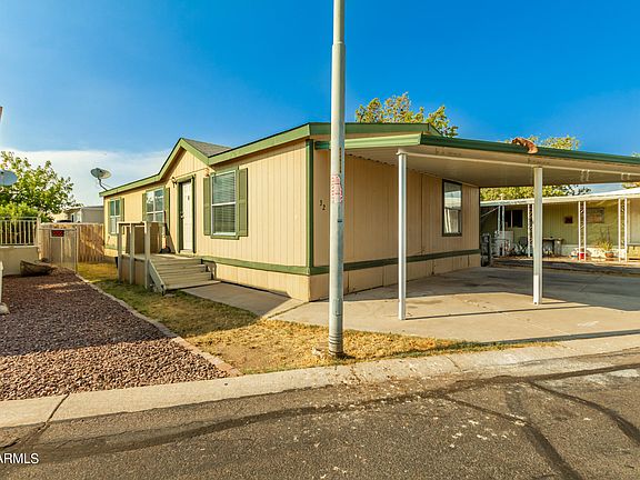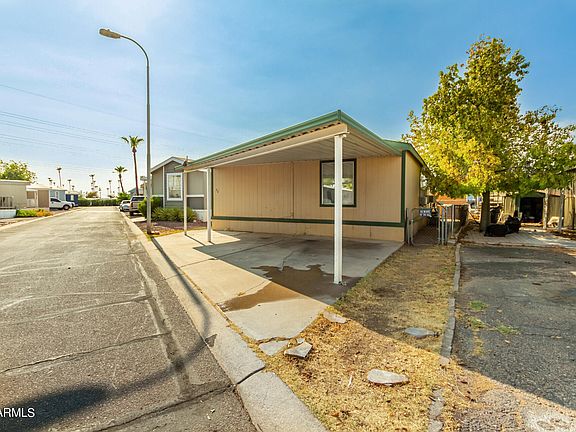 Move-in ready! Seize the opportunity to own this renovated mobile home. A cozy front porch and carport parking for your vehicle. The immaculately designed interior boasts a generously sized living room adorned with vaulted ceilings, soothing paint tones, and wood flooring. The eat-in kitchen is equipped with plenty of white cabinetry and counter space, recessed lighting, a pantry, and a sizable island with a breakfast bar. The carpeted main retreat has a private bathroom and a walk-in closet for convenience. Out the back, you have a storage shed for your tools. This property is minutes away from restaurants, shopping spots, schools, and downtown Mesa. Don't let this one get away! Seller updated the HVAC condenser, new window units installed & seller willing to paint exterior buyers choice