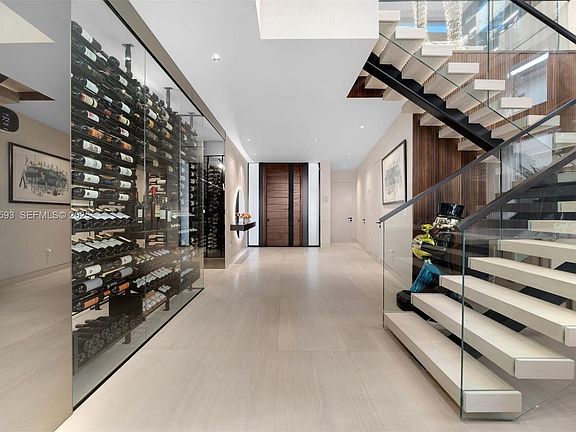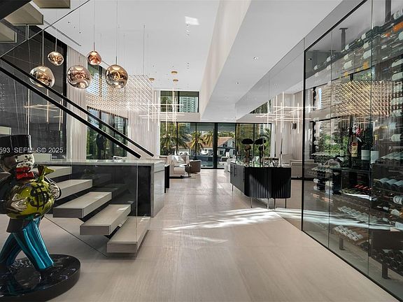 Completed in 2024, this newly built modern masterpiece in coveted Golden Beach offers exceptional craftsmanship, striking design, & a tranquil outdoor oasis created for waterfront living. Sitting on a 10,476 SF lot, this 6,773 total SF residence welcomes you with an oversized driveway & grand architectural entry framed by floating steps. Inside, features a Mia Cucina kitchen w/ Taj Mahal stone, limestone floors on the main level, warm wood upstairs, frameless doors, high end light fixtures, Cristallo stone bar, and Control 4 smart home system w/ Lutron lighting. The spacious primary suite showcases dual walk-in closets and large terrace capturing stunning sunsets. Elevator, pajama lounge & wine room complete the sophisticated interior. 45 feet of water frontage, private dock, Sub-Zero & Wolf summer kitchen, & outdoor shower create a true resort setting.
