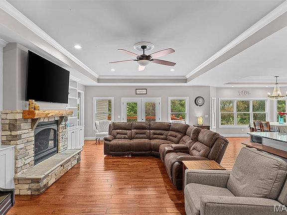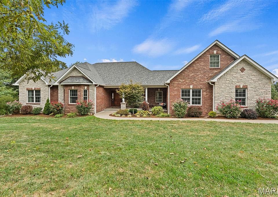 A very rare opportunity can be Yours! This custom built 6Bed 4-1/2Bath Ranch, sits on a 5+ acre secluded lot surrounded by Your woods, and has over 4500sf of finished living space! Enter through the welcoming foyer which opens to the Great Room with soaring coffered ceiling, raised hearth fireplace and French Doors that opens to the large deck overlooking the backyard. Connecting is the Dream Kitchen...granite counter tops/tile backsplash, custom cabinets, stainless appliances, gas 5 burner cooktop, and built in double oven...completed with center island and breakfast bar. Dining Room, with a bay window welcomes lots of light. A main floor Primary Suite w/bay window, has his/her's walk-in closets and double vanity private bath w/separate tub & shower. A split floor plan has 3 additional bedrooms and 2 full baths on the opposite side of the main floor laundry. The finished walk-out LL, a possible "In-Law suite", offers 2 more bedrooms, full bath, LARGE family room, media room, and is plumbed and wired for a full kitchen. and there's loads of storage space. There is an oversized 2 car garage w/side entry and a second oversized 1 car hollow core garage w/back entry. Other features include exterior wood burning stove which can heat the entire house, dual HVAC, tankless water heater, central vacuum system, and the Bonus Room. Take a drive "through the woods" and see all this home has to offer! Easy access to Hwy 100 and I-44!