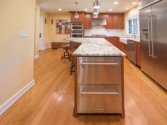 Bright well-lit eat-in kitchenBackyard patio retreatNew hvac systemOversized refrigeratorGas stove topHardwood floorsLush foliage