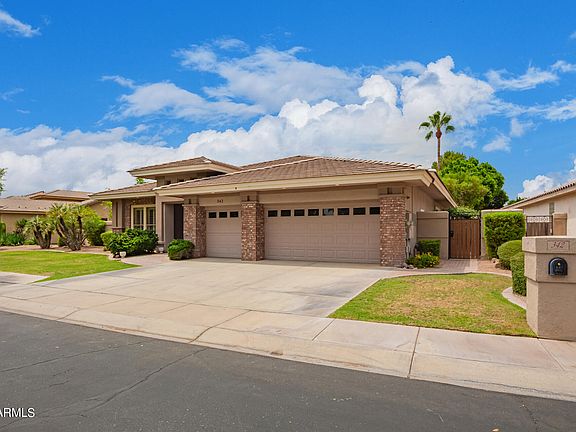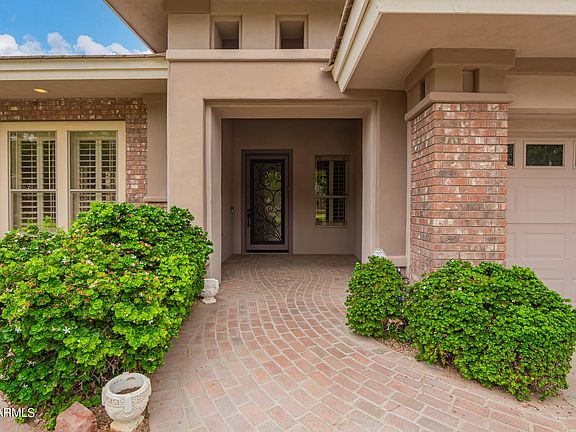 Explore the allure of this exquisite Tempe residence! Lush, verdant front yard, a brick-accented facade, and a spacious three-car garage. Discover a world of refined elegance featuring plantation shutters, a neutral color palette, and intricate layered crown moulding. The expansive living/dining area invites relaxation, while the den offers an Arcadia door and built-in bookcases/desk space. Enjoy the bright great room with its gas fireplace and a chef's kitchen showcasing rich wood cabinetry, granite counters/backsplash, state-of-the-art appliances, and a central island with a breakfast bar. The primary retreat provides backyard access and a luxurious ensuite with dual vanities, soaking tub, and generous walk-in closet. Brand New AC unit just installed! A finished basement features additional space for entertainment with a built-in media niche, a storage area underneath the staircase, and sizable bedrooms. Outside, a covered patio w/misting system, wood-burning fireplace, built-in BBQ, and putting green create the perfect backdrop for relaxation or entertaining. This stunning home is a true Tempe gem, ready to enchant and delight!