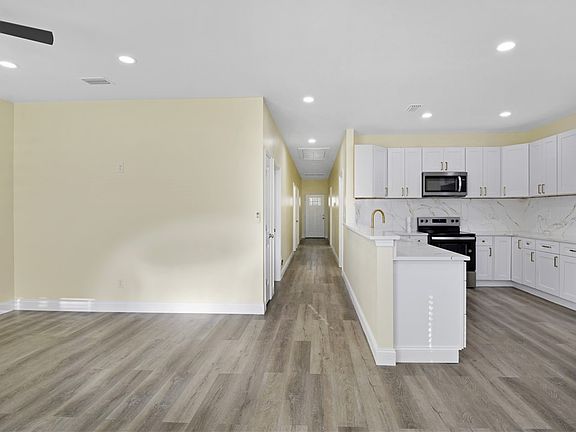 Cross the threshold, and the home's signature shotgun flow captivates: an unobstructed sight-line from front door to back, flooding the space with natural light and a sense of boundless potential, much like the neighborhood's own upward trajectory. At its core lies an airy open-concept living, dining, and kitchen, where everyday moments unfold effortlessly under the soft spin of ceiling fans. Durable LVP flooring is used throughout, grounding the space in practicality, while the kitchen shines with top-tier stainless steel appliances, primed for the meals that will be coming. Overhead, a resilient metal roof safeguards it all, a nod to enduring quality.