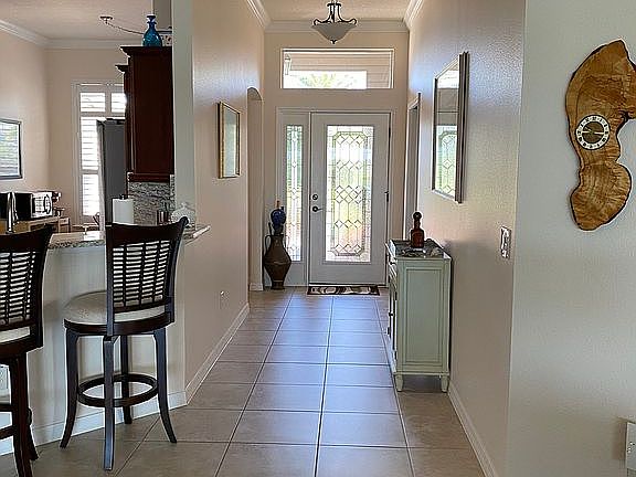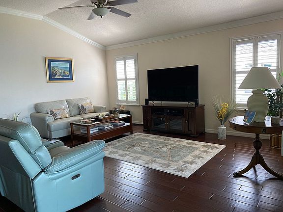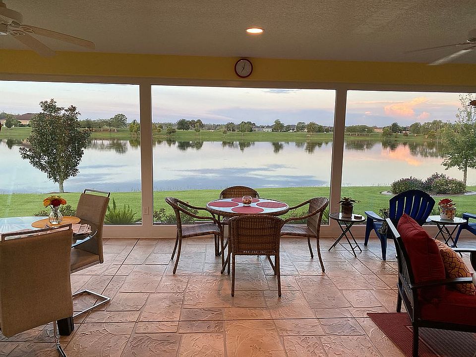 One of the Most Popular Plans in The Villages, this 3 Bedroom, 2 Bath Designer Model features an AMAZING WATER VIEW! As you enter the home, your eyes are immediately drawn to the Spectacular Water View. The Huge Enclosed Glass Lanai with Large Floor to Ceiling Picture Windows enhances the already Great Water View. You will find Engineered Hardwood Floors in Living & Dining areas, Tile Floors in main areas & Carpet in Bedrooms. The Kitchen features Granite Counter Tops with Full Granite Back Splash & Stainless Steel Appliances. The Large Master Bedroom features Custom Ceiling with Ceiling Fan. The His & Hers Master Bedroom Closets feature Custom Closet Organizers. The Master Bath with Roman Shower features Dual Sink Granite Vanities. The front bedroom features a 3 foot extension with Bay Windows. The Guest Bath features a Granite Vanity Top & Tiled Shower with tub. Crown Molding & Plantation Shutters are features thru out home. The Enclosed Lanai has a Mini Split for Heat & Air & Custom Flooring. The 2 Car Garage features a 2 Deep Golf Cart Garage. A Custom Painted Driveway, Tropical Landscape with rock beds & Stacked Stone Walls & Custom Concrete Curbing help complete the Beautiful Home. Similar Tropical Landscape with Custom Concrete Curbing and rock beds in backyard. The Village of Charlotte is a central location to several shopping plazas, dining choices, health care & recreational facilities, Championship & Executive Golf Courses are within a short golf cart ride away.