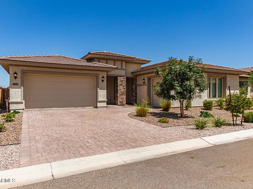 Discover contemporary living in the gated Gardener's Enclave community! Soaring 10' ceilings, electric shades, and natural light enhance the great room layout. The gourmet kitchen impresses with quartz countertops, floating soft-close cabinets, GE double wall ovens, and Bosch fridge, and stainless steel appliances. Retreat to the primary suite oasis, complete with an electric fireplace, a spa-like bath with a rain shower and soaking tub, a dual-sink vanity, and private backyard access. Each guest room features a walk-in closet and an en suite. Upgrades include built-in speakers in the living room and covered patio, water softener, Electrolux washer and dryer, and SimpliSafe security system. The 3-car garage includes built-in cabinets. Conveniently located near shopping, dining, and more!
