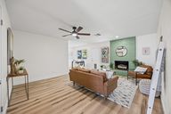 Modern hardwareGreen brick fireplaceLoft areaNew vinyl plank flooringDedicated work-from-home spaceCovered patioMature trees