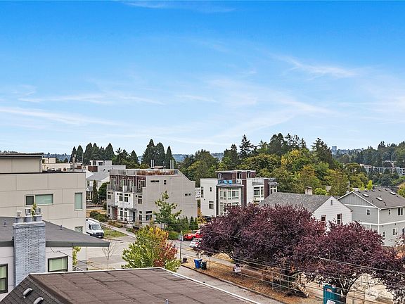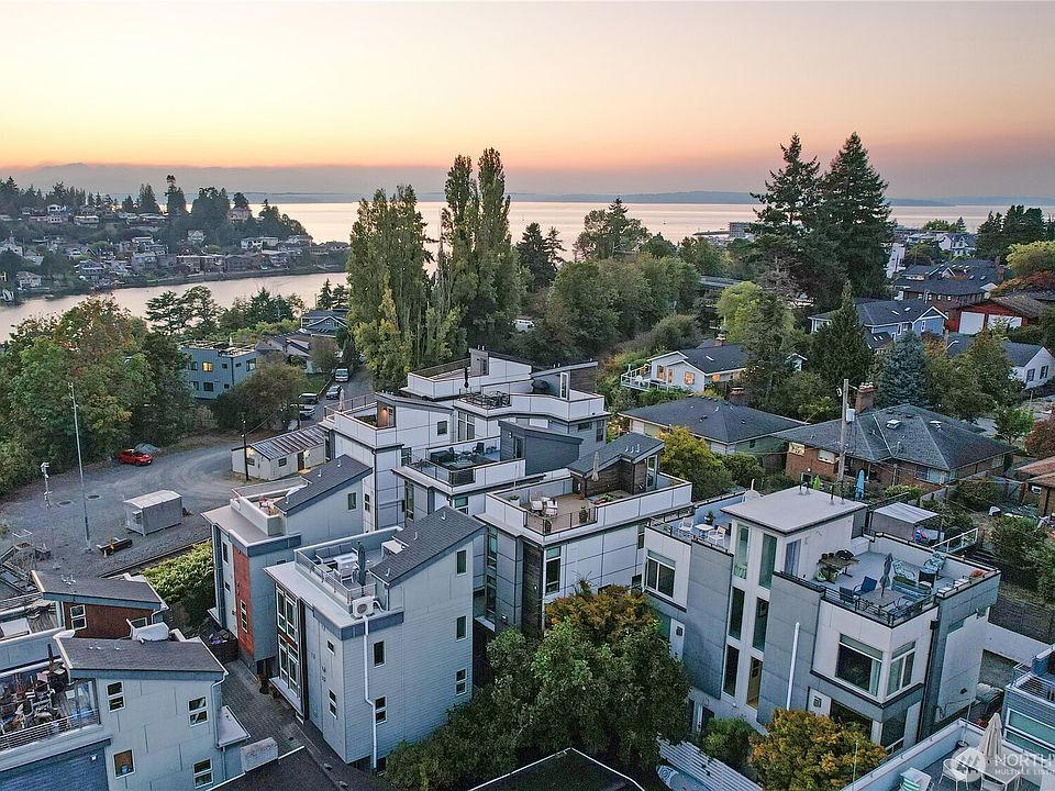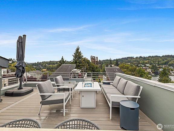 Perched above Salmon Bay in Sunset Hill, this stand-alone home offers exceptional quiet thanks to interior storm windows, while capturing sweeping views and sunsets from a low-maintenance composite deck atop a brand new roof with transferrable warranty ($114k). Floor-to-ceiling windows frame water, greenery, and Salmon Bay Bridge. Open kitchen pairs with site-finished hardwoods and floating stairs. The primary suite offers views, a walk-in closet, and spa-like bath. Custom upgrades to this 3-bed, 2.25-bath home include custom cabinetry, Murphy bed, under-stair storage, and an indoor/outdoor catio that can stay or go. A wet bar adjacent to the rooftop deck makes entertaining effortless. Dedicated parking. Walkable to all that Ballard offers.